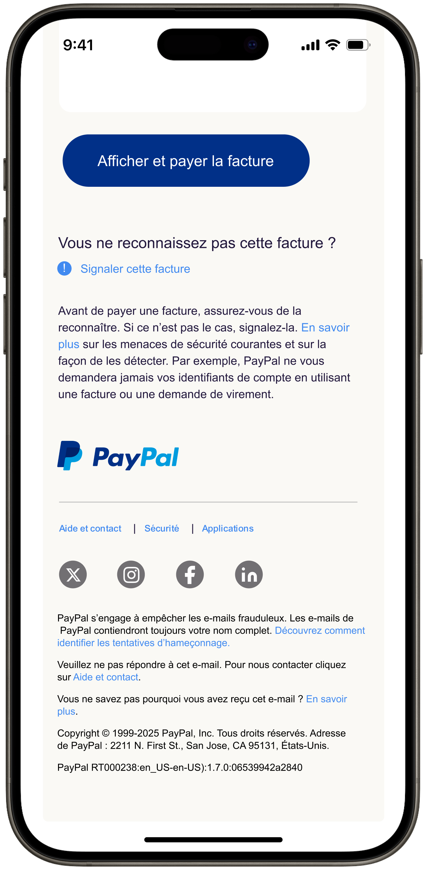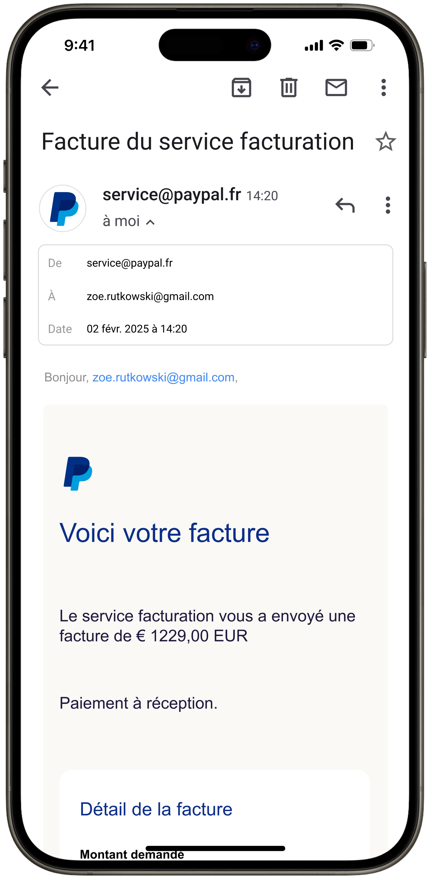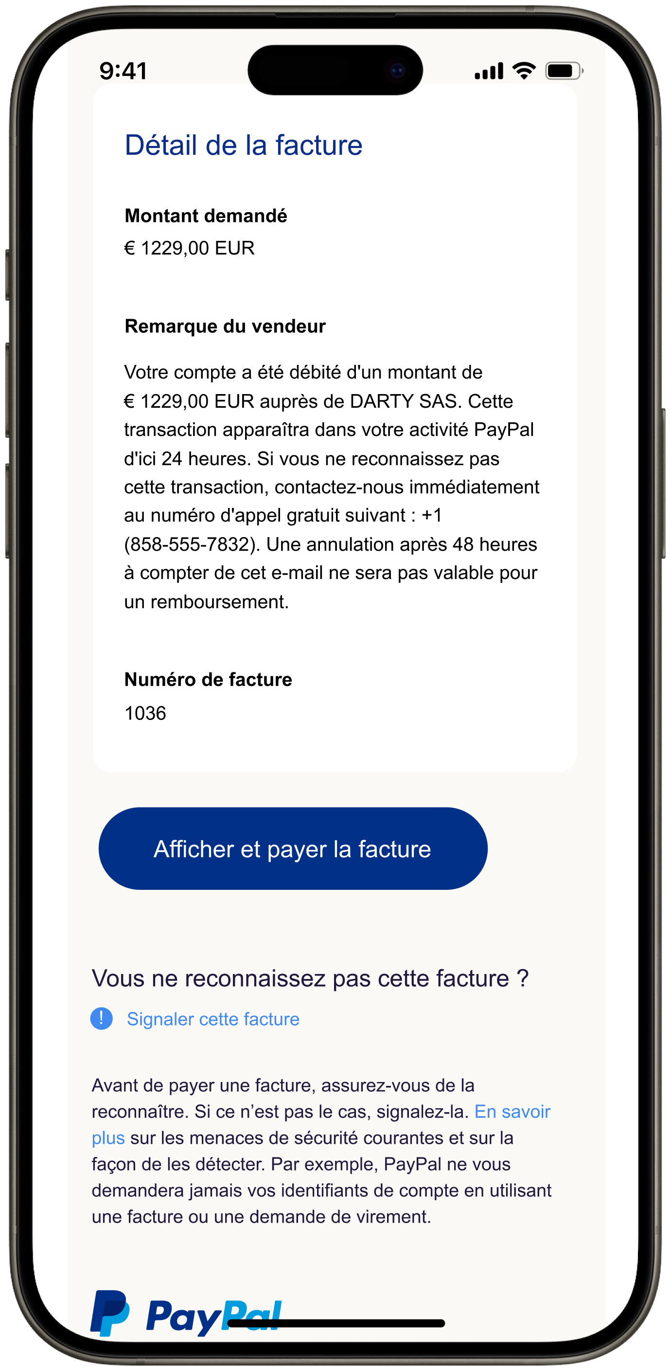 Si tu reçois ce type de facture frauduleuse, ne paie rien et signale-la directement à PayPal. (en savoir plus ici)